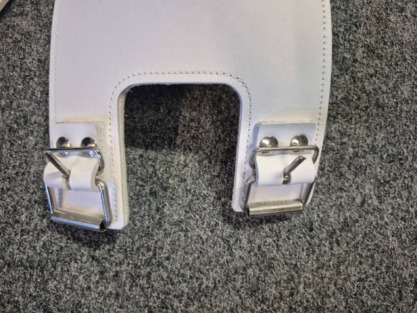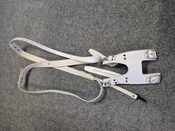 Harnais en cuir blanc, doublé de feutre, avec crochets et anneaux en métal solide (pas en velcro...)